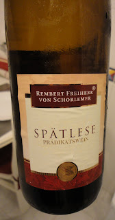Ontem fui a um supermercado Aldi ver os vinhos que por lá têm. Encontrei umas coisas interessantes mas o que me despertou mais foi este. Pelo rótulo, não comprava, mas como eu gosto de ler os contra-rótulos, veio comigo para tirar teimas. Pelo preço e o tipo de vinho que dizia ser, não ia vingar nem no copo nem em lado nenhum, mas foi uma agradável surpresa. Um colheita tardia alemão, do Baron Von Schorlemer de Rembert, em Tyskland. Abri a garrafa e gostei, considerando o preço do vinho, é uma boa escolha.